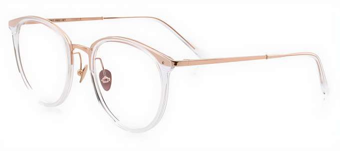 Round-shaped optic frame presents the unique color combination of acetate and temple. The remarkable light weight is attributed to the use of titanium.